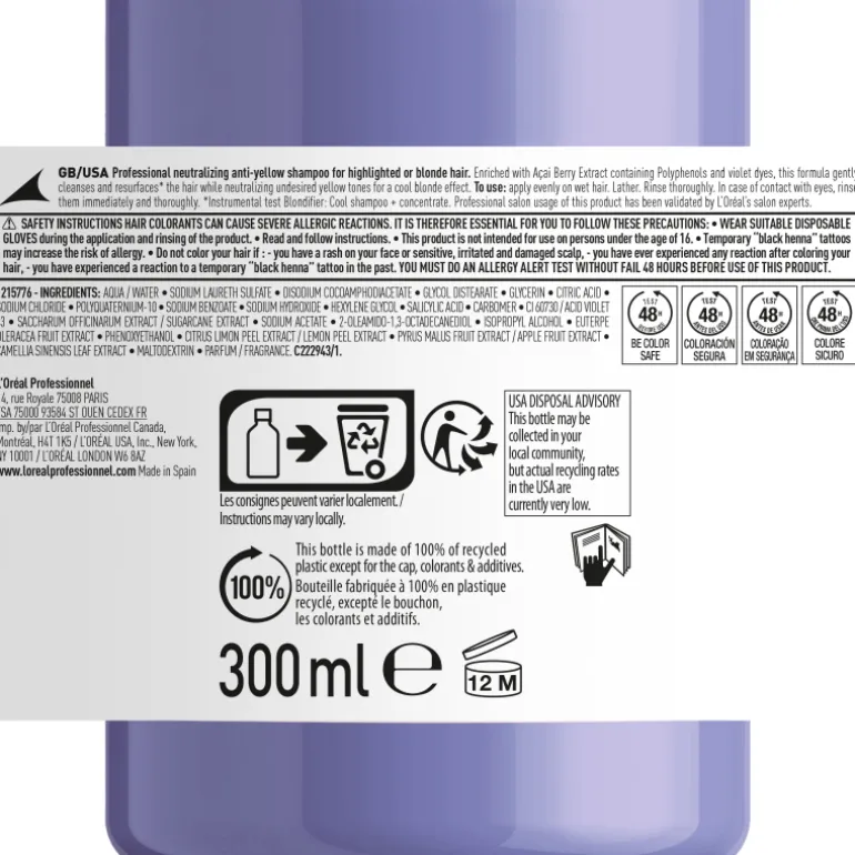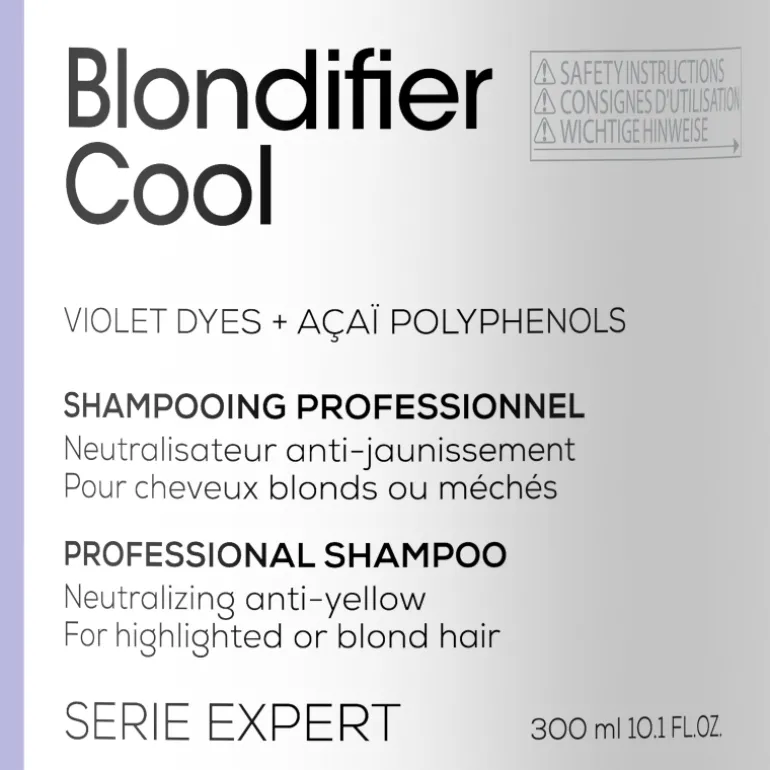 L’Oréal Professionnel Blondifier Cool Shampoo est un shampooing violet créé pour matifier et neutraliser les tons jaunâtres qui peuvent apparaître dans les cheveux blonds froids.