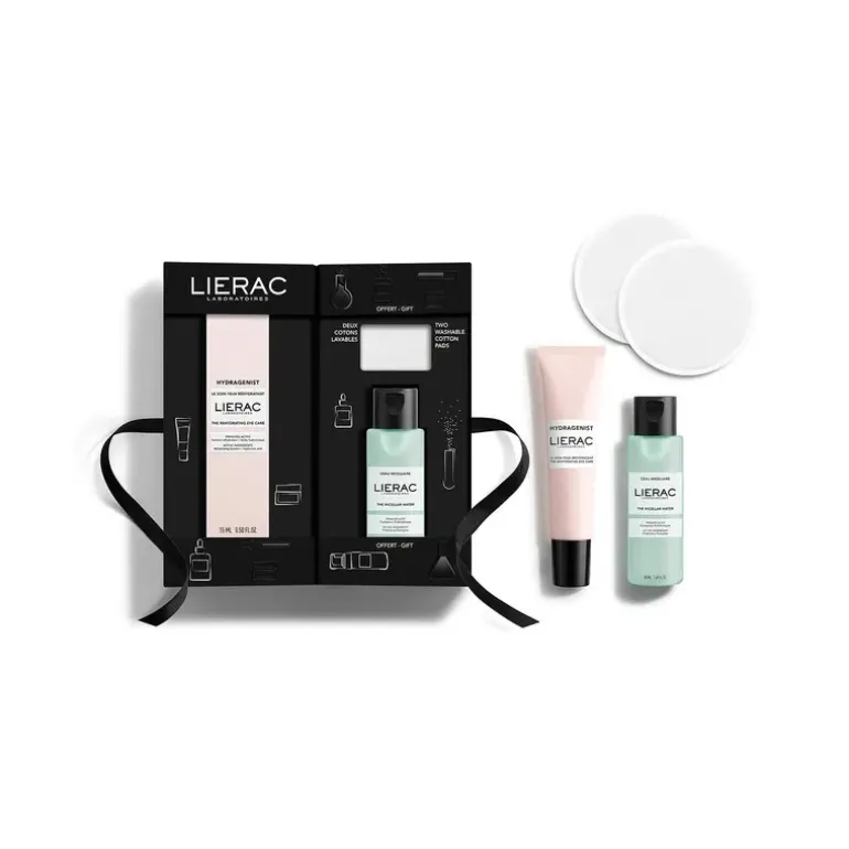 Ce coffret Lierac contient . Hydragenist Traitement Réhydratant pour les Yeux 15ml. Traitement réhydratant pour les yeux : formulé avec 96% d’ingrédients d’origine naturelle, le Traitement réhydratant pour les yeux hydrate instantanément la peau du contour de l’œil et lisse les ridules, réveille et illumine le regard. Eau micellaire 50ml CADEAU. L’Eau Micellaire : composée à 96% d’ingrédients d’origine naturelle, l’Eau Micellaire nettoie et démaquille en douceur le visage et les yeux. Au cœur de la formule, le Complexe Prébiotique Marin préserve et renforce le microbiote cutané. Sa texture fraîche et délicatement parfumée laisse la peau propre, douce et lumineuse.
