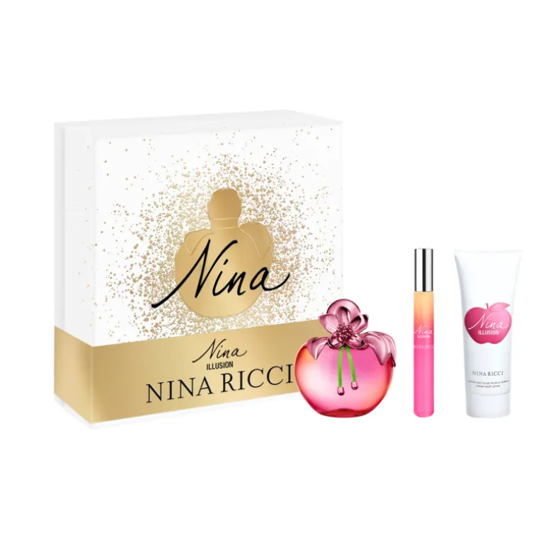 Ce coffret contient une Eau de Parfum Nina Illusion 80 ml, un Lait Corporel 75 ml et un vaporisateur de voyage 10 ml.
