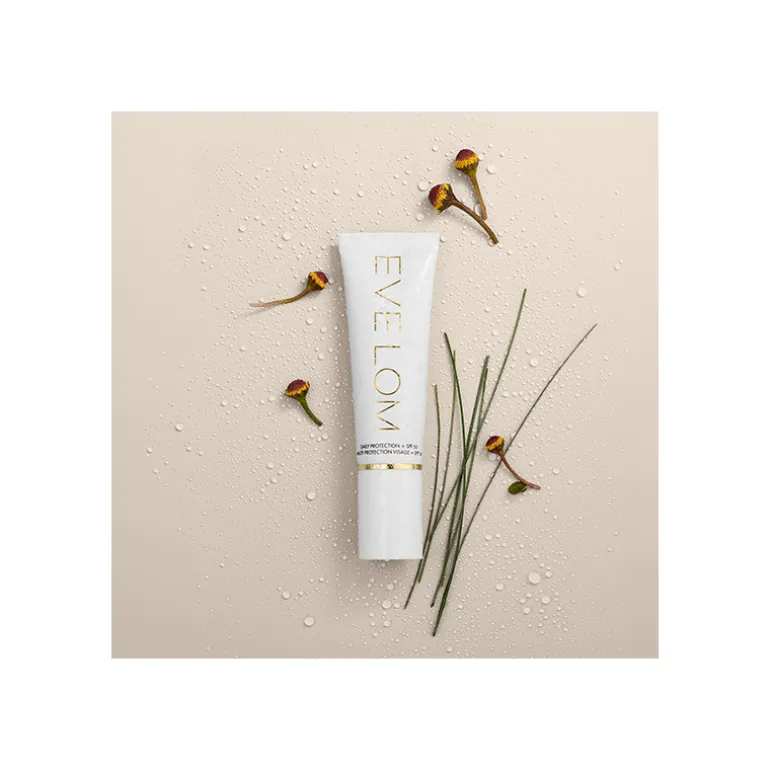 Le Daily Protection + SPF 50 d’EVE LOM, mélange spécifique d’écrans solaires, de vitamines et d’extraits naturels, protège des rayons UVA et UVB (il est classé PA ++++, l’indice de protection UVA le plus élevé), éclaircit, hydrate, raffermit et retend la peau.