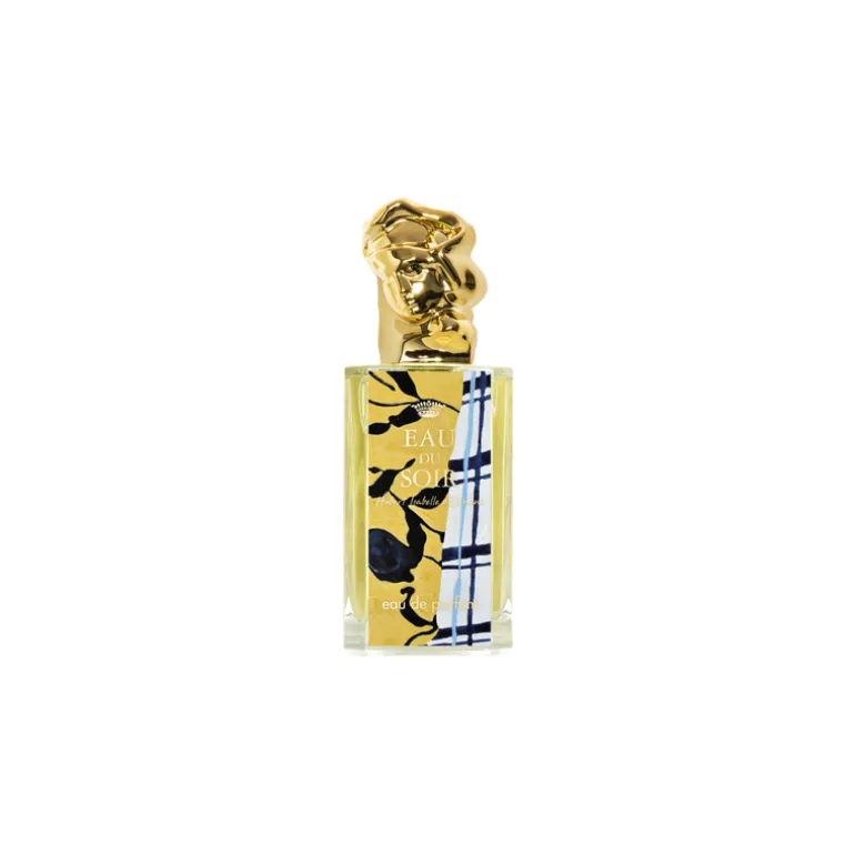 Les volutes végétales et le ton jaune riche et chaud, en contraste avec le bleu doux, prolongent l’expérience olfactive en une expérience visuelle forte.