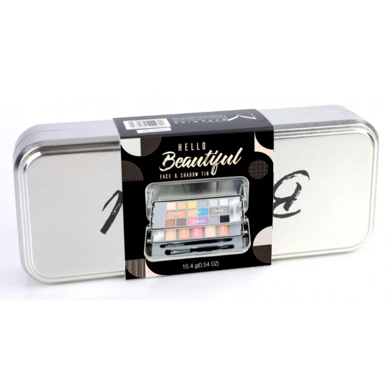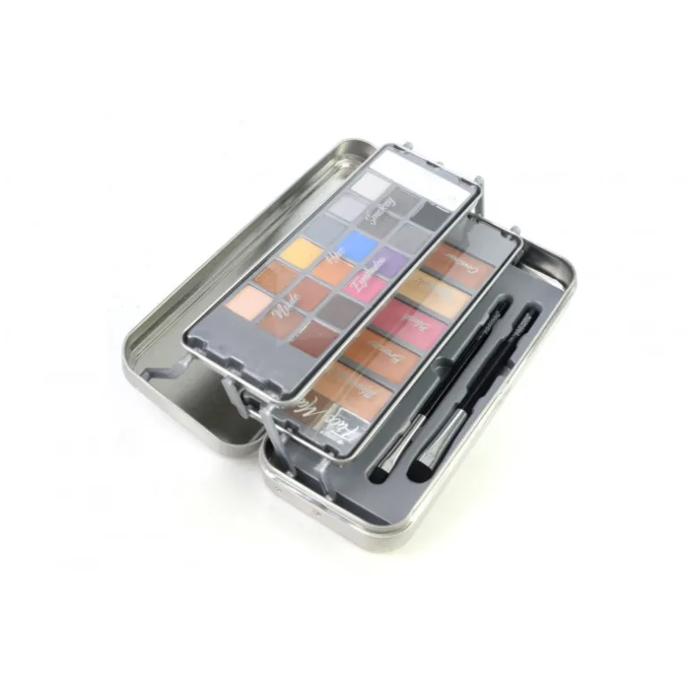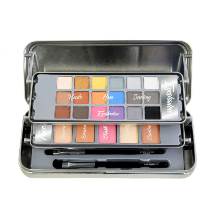 Une boîte comprend : 24 nuances d’ombres à paupières, 3 nuances pour les sourcils, une poudre de contour, un surligneur, un bronzeur, un fard à joues, 3 pinceaux à maquillage.