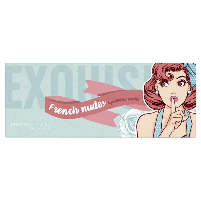 Trousse de maquillage avec 12 ombres à paupières nude + pinceaux. Il est présenté sous forme de livre avec un miroir intérieur au design vintage en turquoise et rose avec un design Pin Up.
