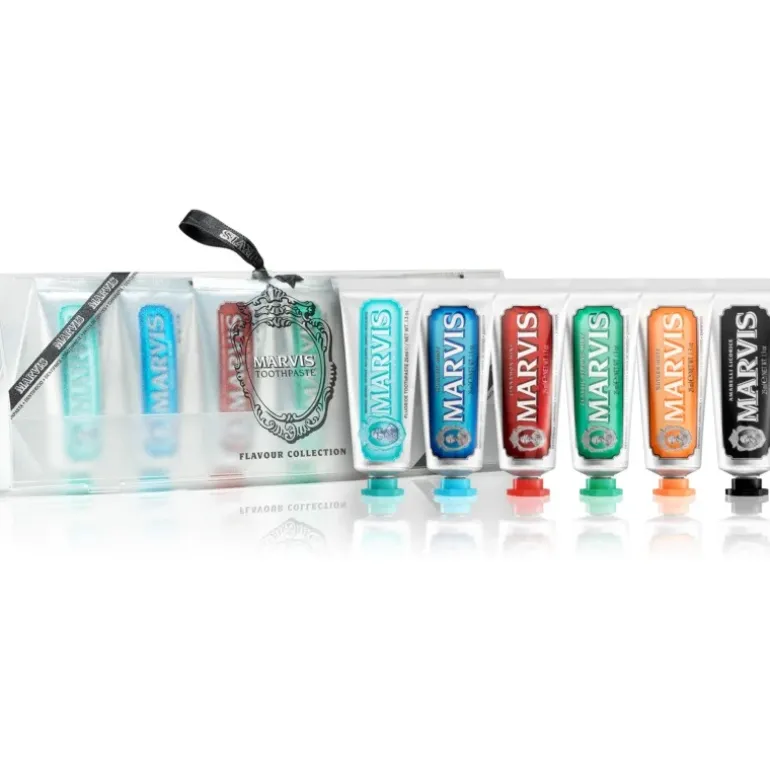 Le coffret de dentifrices Marvis 6 saveurs contient une crème nettoyante aromatisée à la menthe, 3 autres aromatisées à la réglisse jaune, au gingembre, au jasmin, et 2 autres aromatisées à la menthe aquatique et à l’anis.
