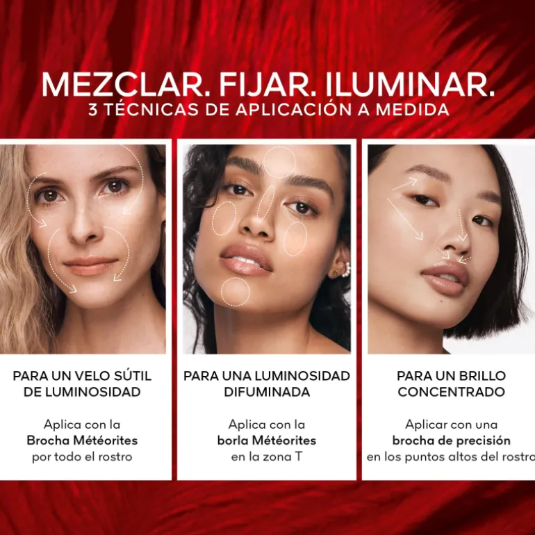 Prélevez les poudres en mélangeant les perles avec le pinceau Météorites¹ et appliquez-les sur l’ensemble du visage pour obtenir un éclat diffus.