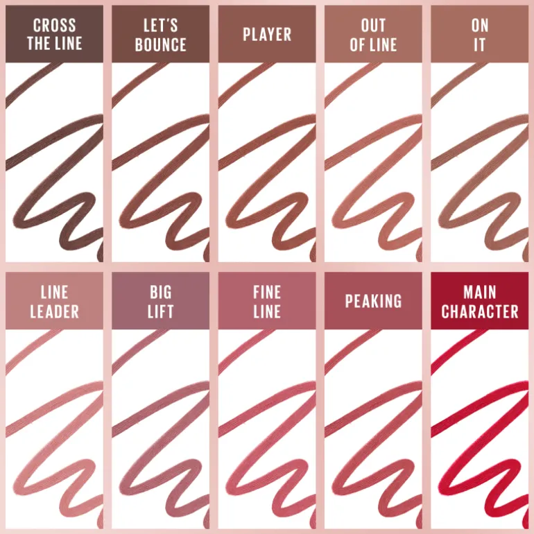Le Lifter Liner à l’acide hyaluronique est disponible en 8 teintes crémeuses : Main Character, Fine Line, Big Lift, Line Leader, On It, Out Of Line, Player et Cross The Line.