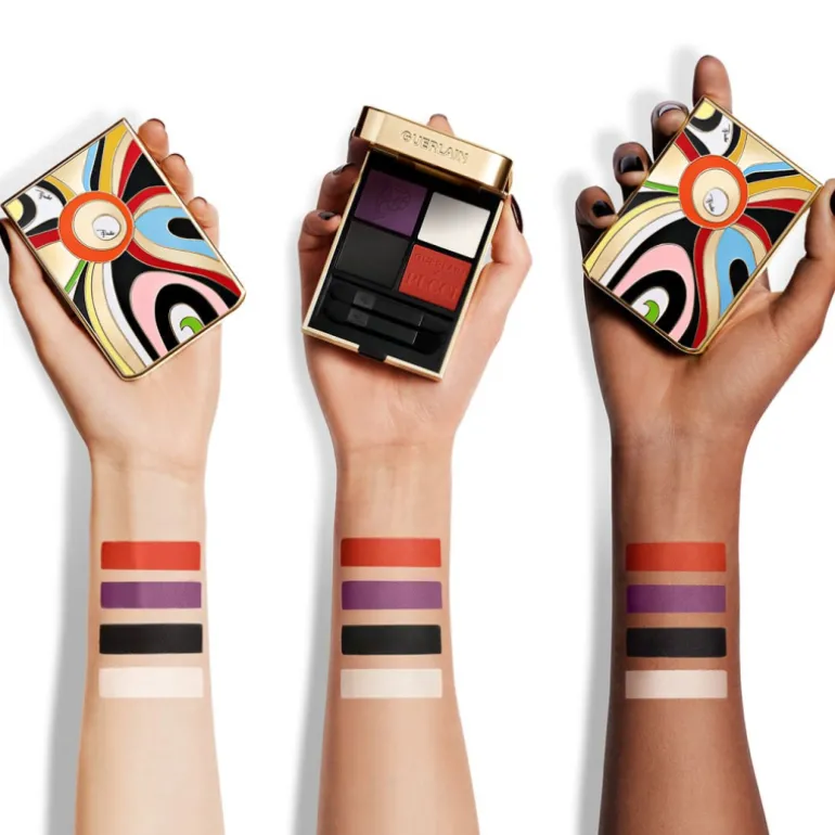 Ombres G en 4 teintes Guerlain Edition Limitée. Camille Miceli, Directeur Artistique de Pucci, et Violette, Directrice de Création Maquillage de Guerlain, ont fusionné leurs talents pour créer Ombres G 045 Marmo Vibe, inspiré du motif iconique Marmo de Pucci.
