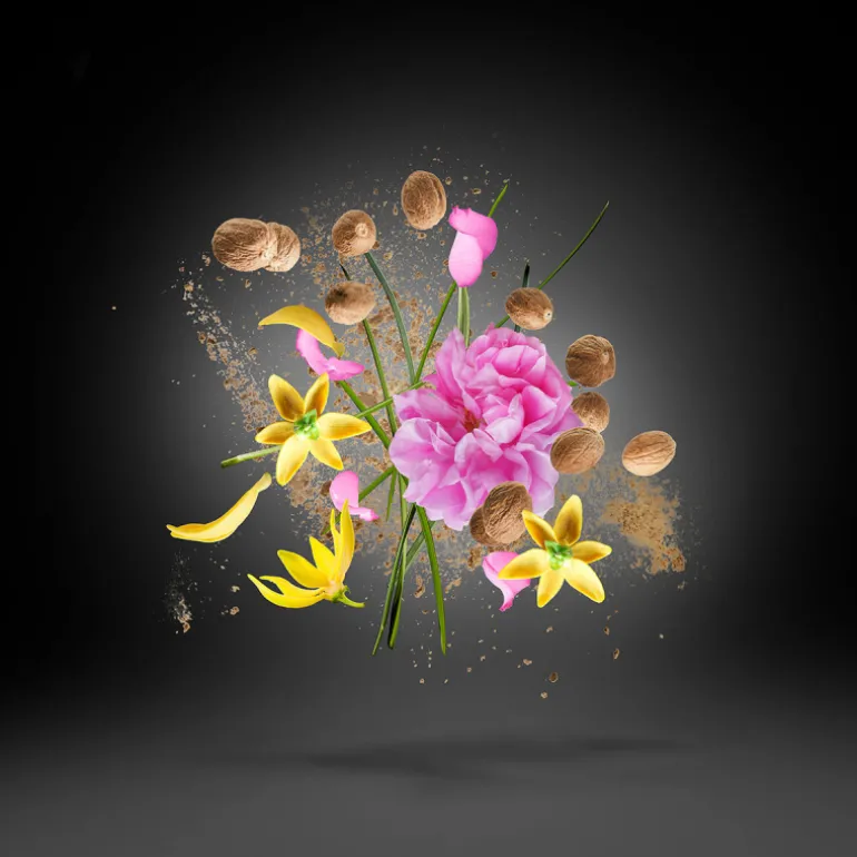 Un soupçon vibrant de noix de muscade et de fruits, accentué par un ylang ylang proéminent et une rose turque, s’élève aux côtés de l’esprit floral épicé, du bois de cèdre, du musc et de la vanille.