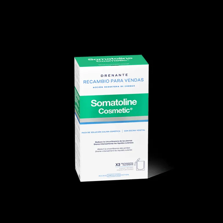 La solution saline osmotique concentrée de principes actifs à l’efficacité drainante intensive pour recharger les pansements drainants Somatoline Cosmetic, 3 traitements.