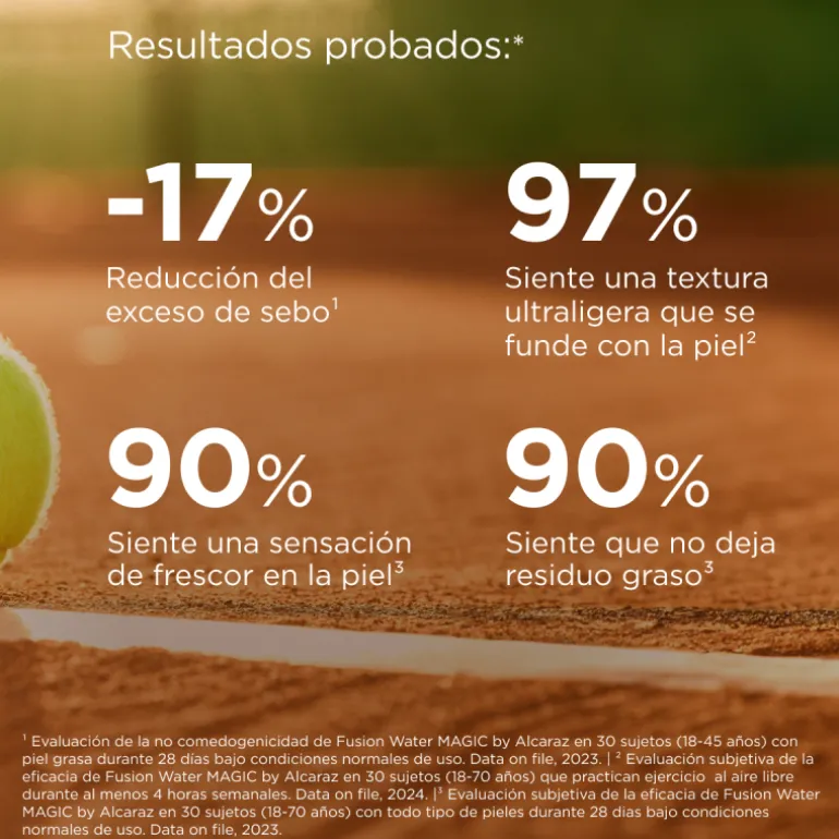 Faites ressortir votre meilleure version avec la crème solaire faciale ultra-légère à usage quotidien Fusion Water MAGIC d’Alcaraz SPF 50. Elle procure un effet rafraîchissant et, grâce à Heat Stress Protect, protège la peau contre les radicaux libres générés par la chaleur dérivée de la pratique sportive.