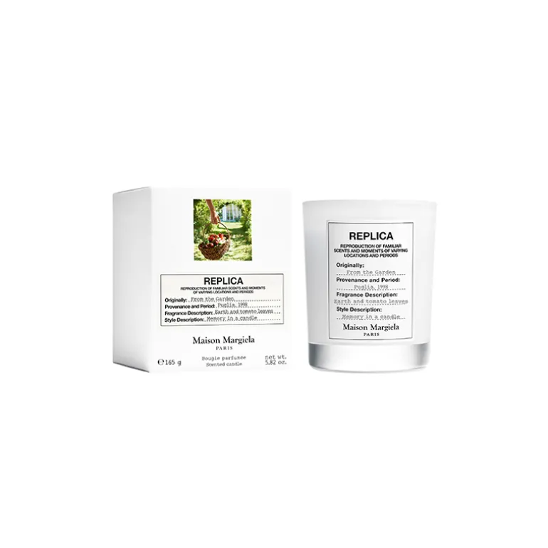 La bougie From the Garden est à la fois parfumée et décorative, avec son verre blanc précieux orné du label REPLICA, emblématique de la Maison Margiela.