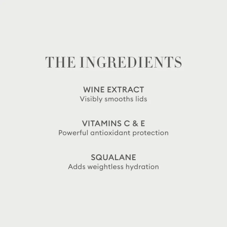 EXTRAIT DE VIN, lisse visiblement les paupières ; VITAMINES C ET E, puissants antioxydants pour le contour délicat du regard ; SQUALENE, un hydratant pur, durable, 100 % d’origine végétale qui procure une hydratation légère ; EXTRAIT DE CAMOMILLE, apaise la peau.
