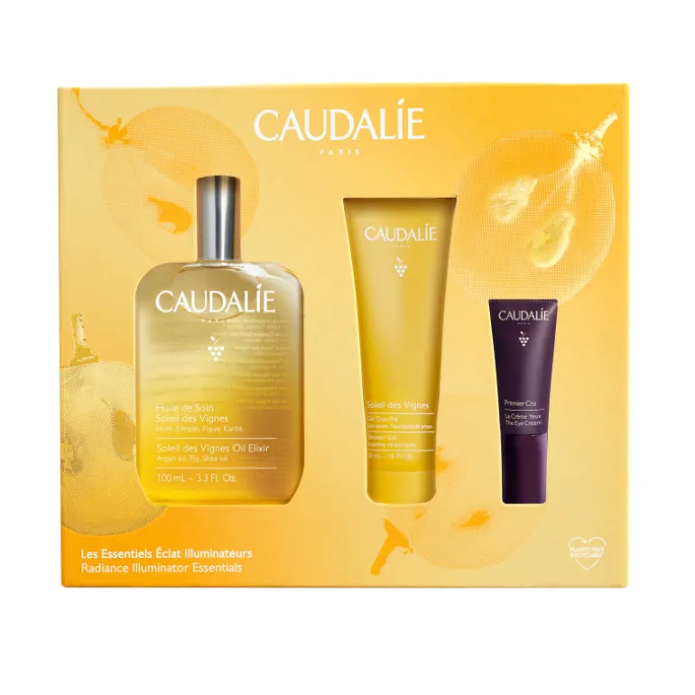 Dans ce coffret, vous trouverez : l’Huile de soin Soleil des Vignes + 2 produits complémentaires dans un coffret de voyage.