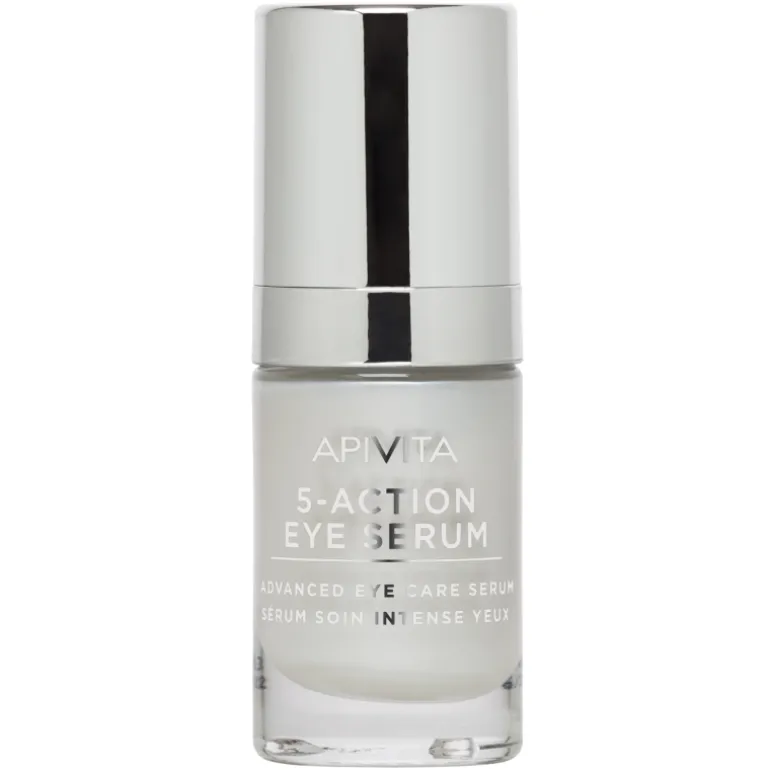 Apivita 5-Action Eye Contour Serum. Un sérum crémeux et léger pour le contour des yeux qui combat les cernes, les poches, les rides d’expression, les rides, le relâchement des paupières et la déshydratation.