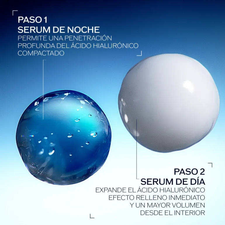 Étape 1 – Sérum de comblement Nuit : contient de l’acide hyaluronique de haut poids moléculaire compacté afin qu’il puisse pénétrer intensément dans l’épiderme** pendant la nuit.
