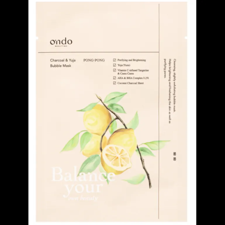 Pong-Pong est une onomatopée coréenne désignant des bulles qui éclatent doucement, un mot frais et énergique qui évoque un agréable nettoyage. Le masque de tissu noir, composé de fibres de noix de coco et de charbon de bois, aide à nettoyer le visage en adsorbant les impuretés de la peau.