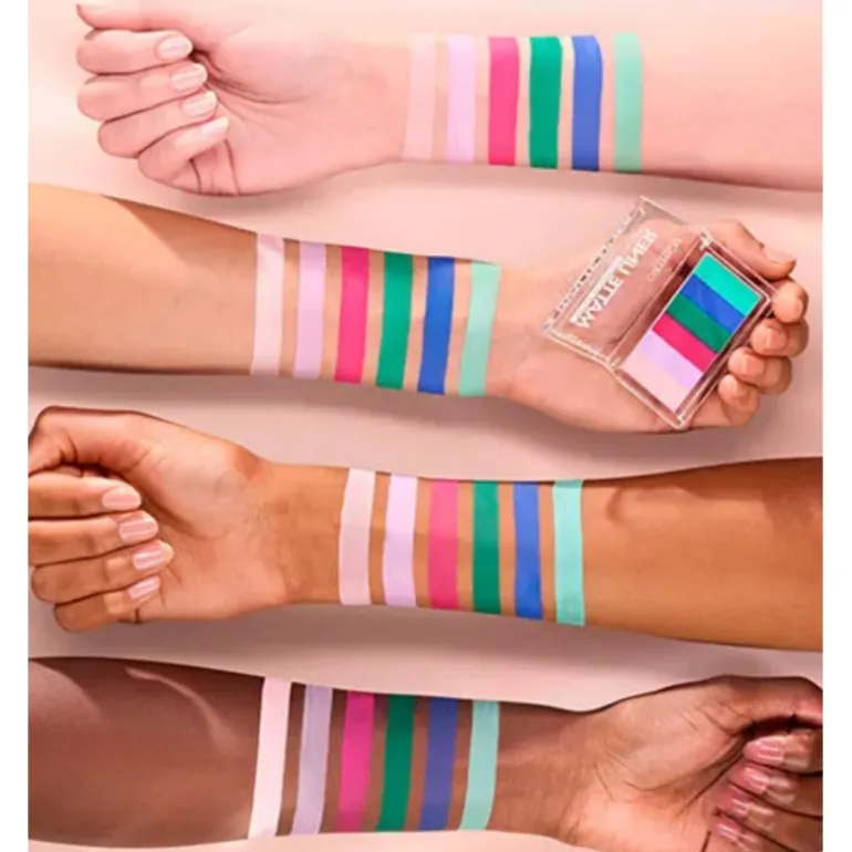 Cette palette comprend six teintes vibrantes, activées à l’eau et au fini mat : rose nude, lilas doux, magenta chatoyant, vert profond, bleu menthe pastel et outremer.