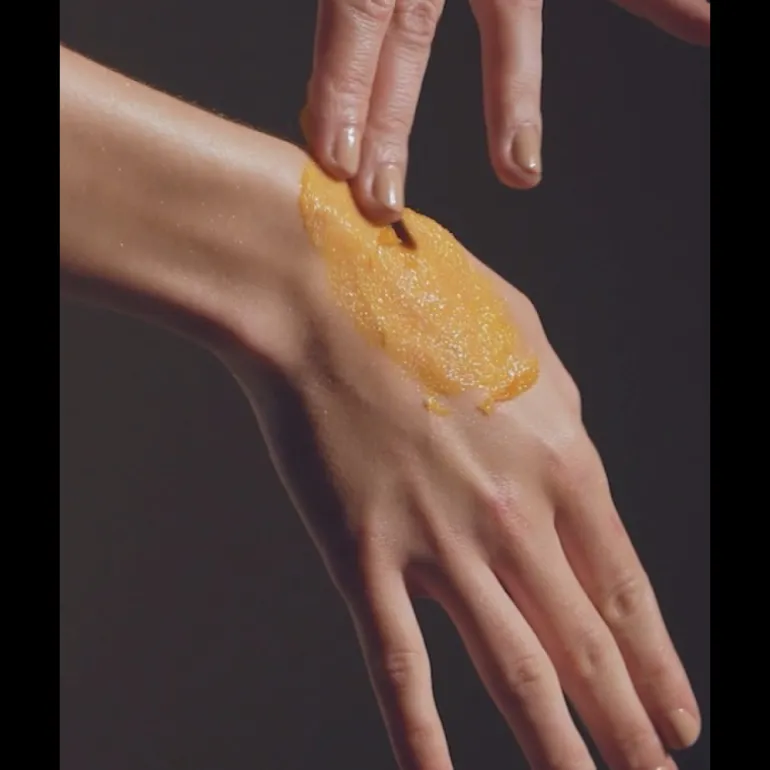 Pour une exfoliation plus intense, masser délicatement sur une peau sèche et propre. Pour une texture plus crémeuse et plus grasse, ajouter de l’eau pour dissoudre les cristaux exfoliants naturels.