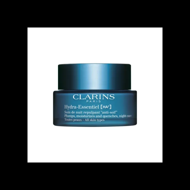 Clarins Hydra Essentiel [ha²] Crème de Nuit. Un soin de nuit hydratant et redensifiant à la texture légère et enveloppante qui réconforte les peaux assoiffées.