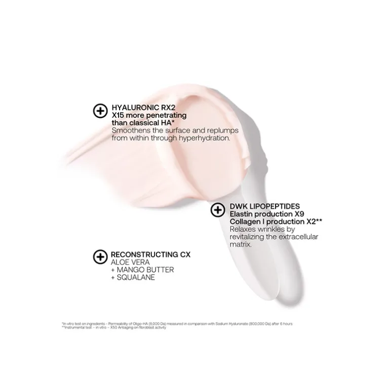 Acide hyaluronique RX2 : 15 fois plus pénétrant que l’acide hyaluronique classique*. Lisse en surface et comble en profondeur par superhydratation.