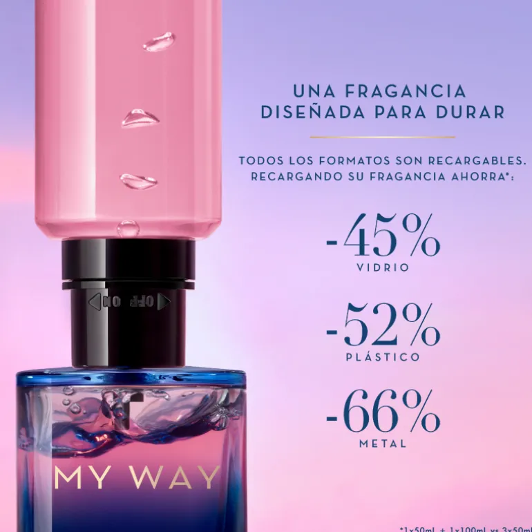 Chaque format MY WAY – 30, 50 ou 90 ml – est conçu pour être dévissé et rechargé chez soi avec la même bouteille de recharge.