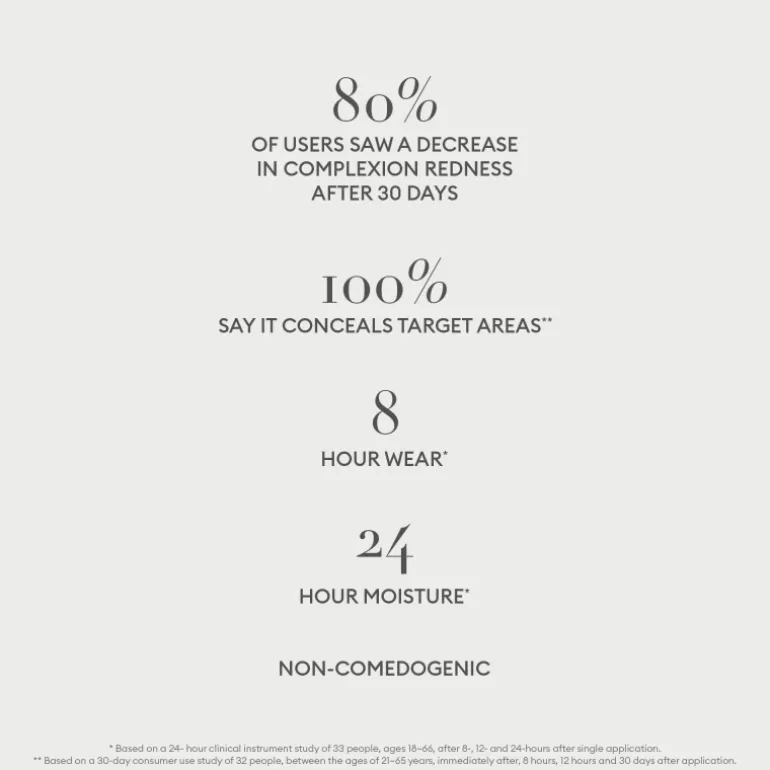 Sa formule liquide longue tenue et couvrance totale minimise l’apparence des rides d’expression, des rougeurs et des décolorations pour un teint uniforme et lumineux.