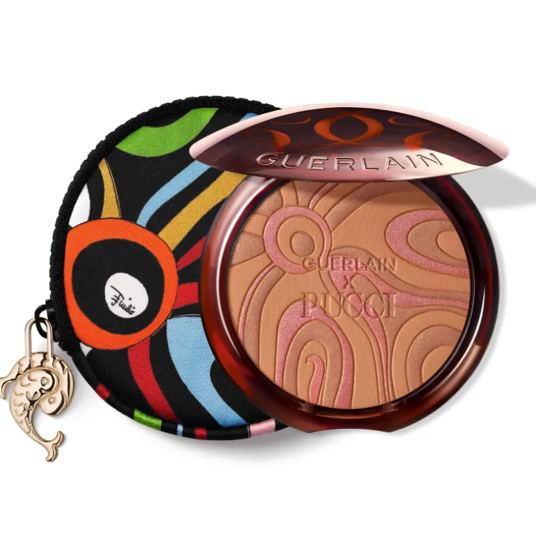 Camille Miceli, Directeur Artistique de Pucci, et Violette, Directrice de la Création Maquillage de Guerlain, associent leurs talents pour rehausser les légendaires poudres Terracotta du motif Marmo, emblématique de Pucci. L’association de deux teintes emblématiques vaporisées de nacre rose dans un coffret Haute Couture.