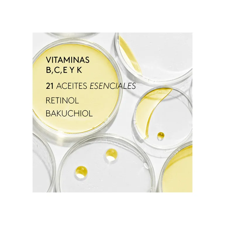 – Explosion de vitamines : action conjointe de vitamines qui stimulent la production de collagène et d’acide hyaluronique. Grand pouvoir antioxydant. Une peau lumineuse et uniforme.